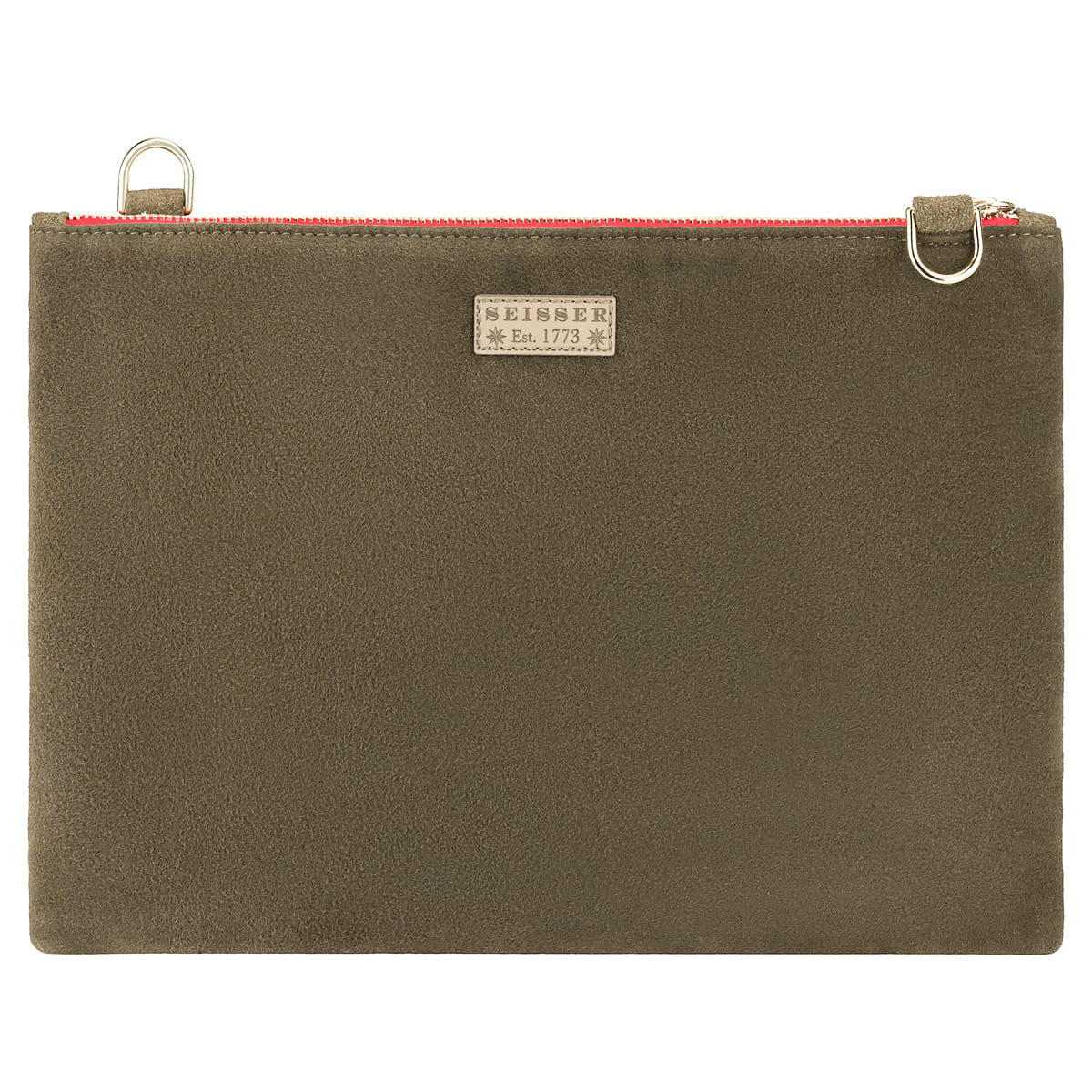 Die rechteckige Clutch von Seisser & Cie. aus sämisch gegerbtem deutschem in braun-oliv Hirsch misst 29 × 21 cm. Das Vintage-Hirschleder hat einen sanft verwaschenem, getragenem Look. Diese Tasche verbindet zeitlose Anmut mit einer rauen, zugleich raffinierten Patina.
