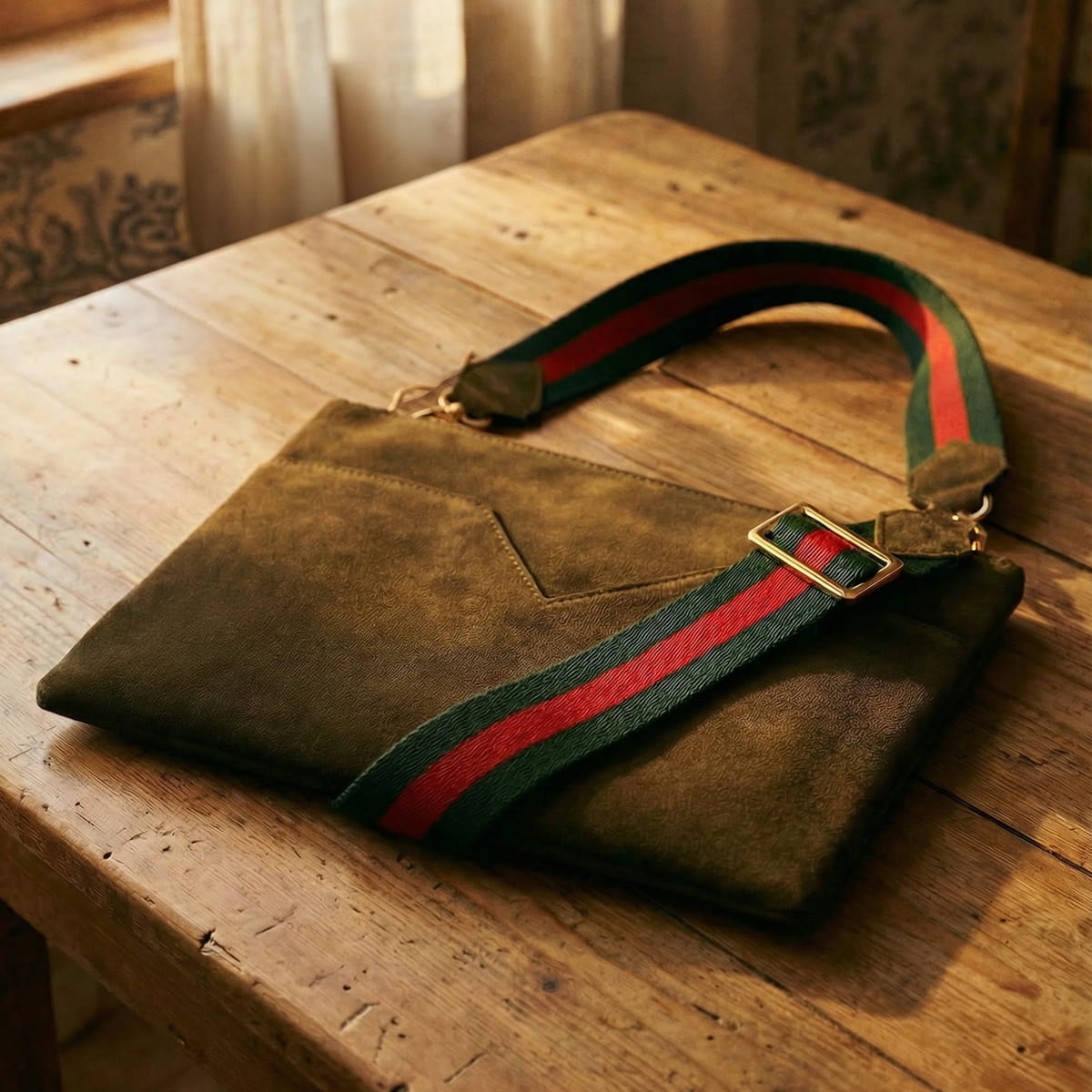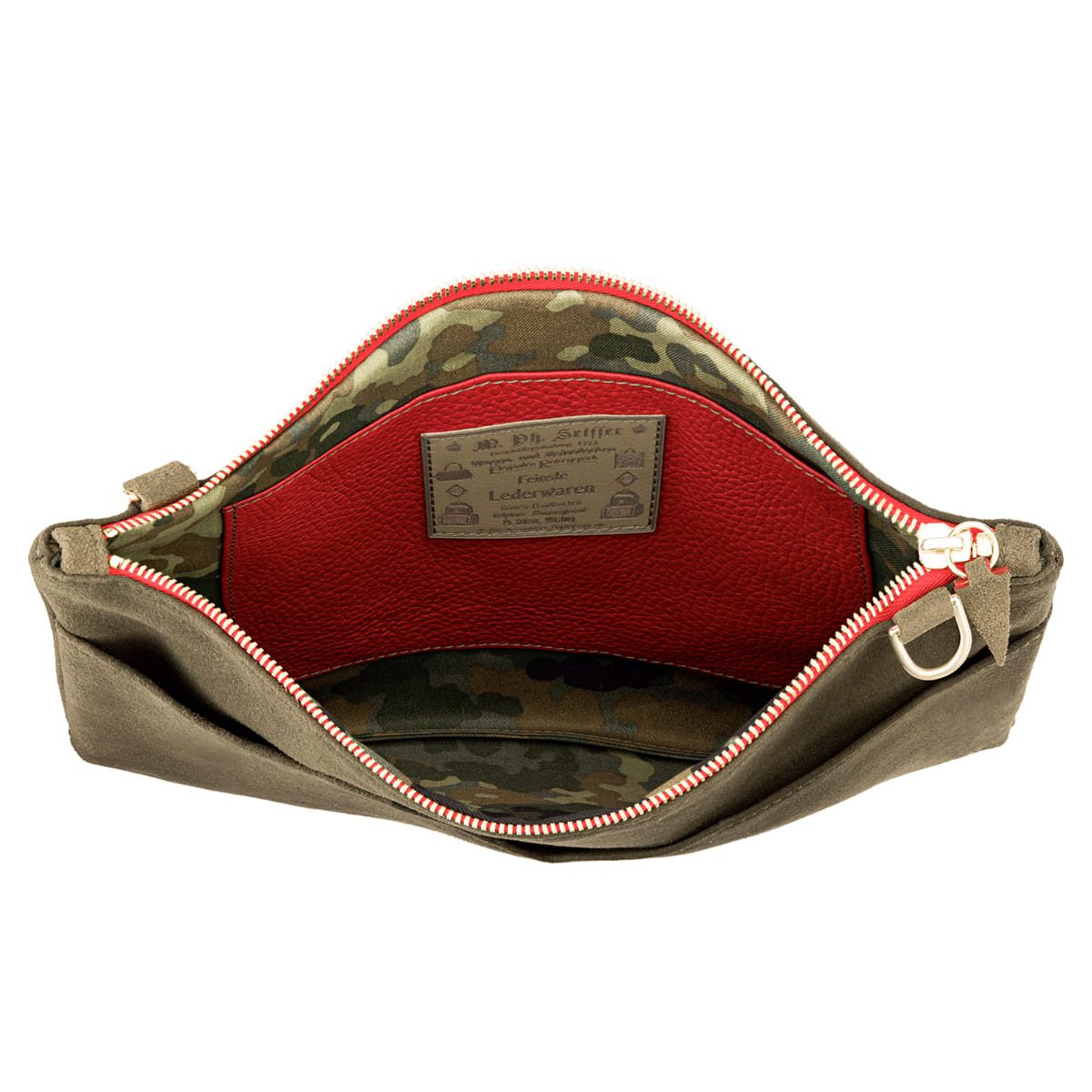 Sie kann dank abnehmbarem Schulterband als Clutch, Umhängetasche oder „Tasche in der Tasche“ genutzt werden. Eine aufgesetzte, gefütterte Vordertasche und eine praktische Klemmtasche innen sorgen für Ordnung, kombiniert mit jagdlichem Camouflage-Futter für einen sportlich-schicken Akzent. Die Außentasche zeigt die klassische Spitzform, die Kanten sind sauber verarbeitet. Webband in Rot und grünem Streifen, Seisser-Vintage-Etiketten und Beschläge in Goldoptik aus deutscher Fertigung runden die hochwertige Verarbeitung ab. Handgefertigt in Deutschland.