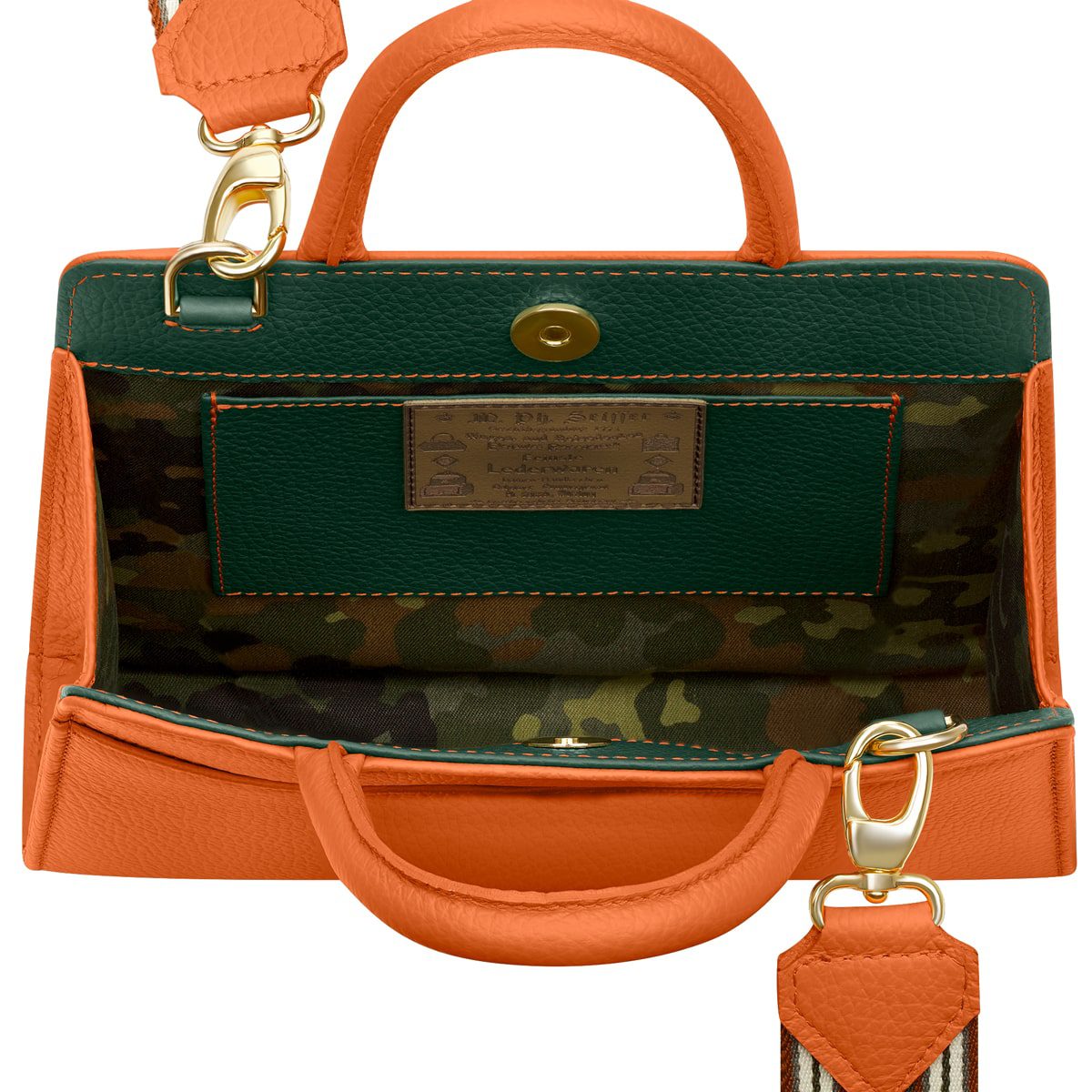 Die Paris/Cortina Mini-Handtasche von Seisser & Cie. vereint Eleganz und Vielseitigkeit: Sie kann mit Handgriffen getragen oder als Umhängetasche/Cross-Body genutzt werden. Innen sorgt eine gefütterte aufgesetzte Vordertasche mit jagdlichem „Hunter-Camouflage“-Futter für sportlich-schicke Akzente, ergänzt durch eine praktische Klemmtasche. Sauber gesetzte Kanten, Seisser-Vintage-Etiketten und Beschläge in Goldoptik unterstreichen die hochwertige Verarbeitung.
