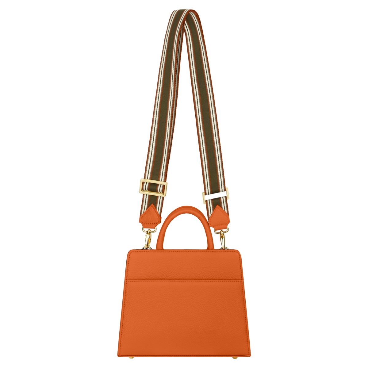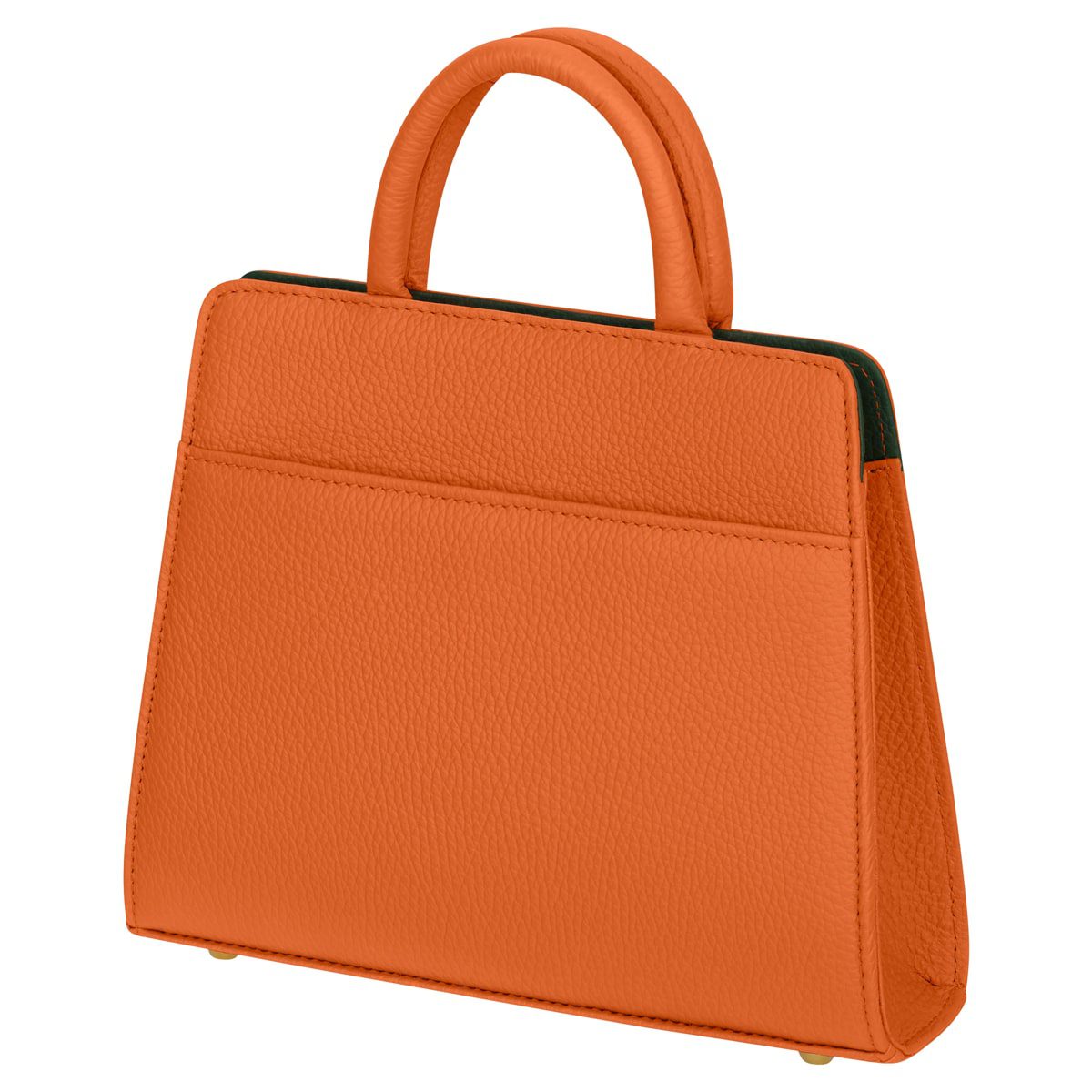 Die Tasche ist mit abnehmbarem Schultergurt bzw. Webband in drei Varianten erhältlich: aus französischem Rindsleder in Orange, aus französischem Rindsleder in Racing-Green oder aus echt sämisch gegerbtem Hirschleder.