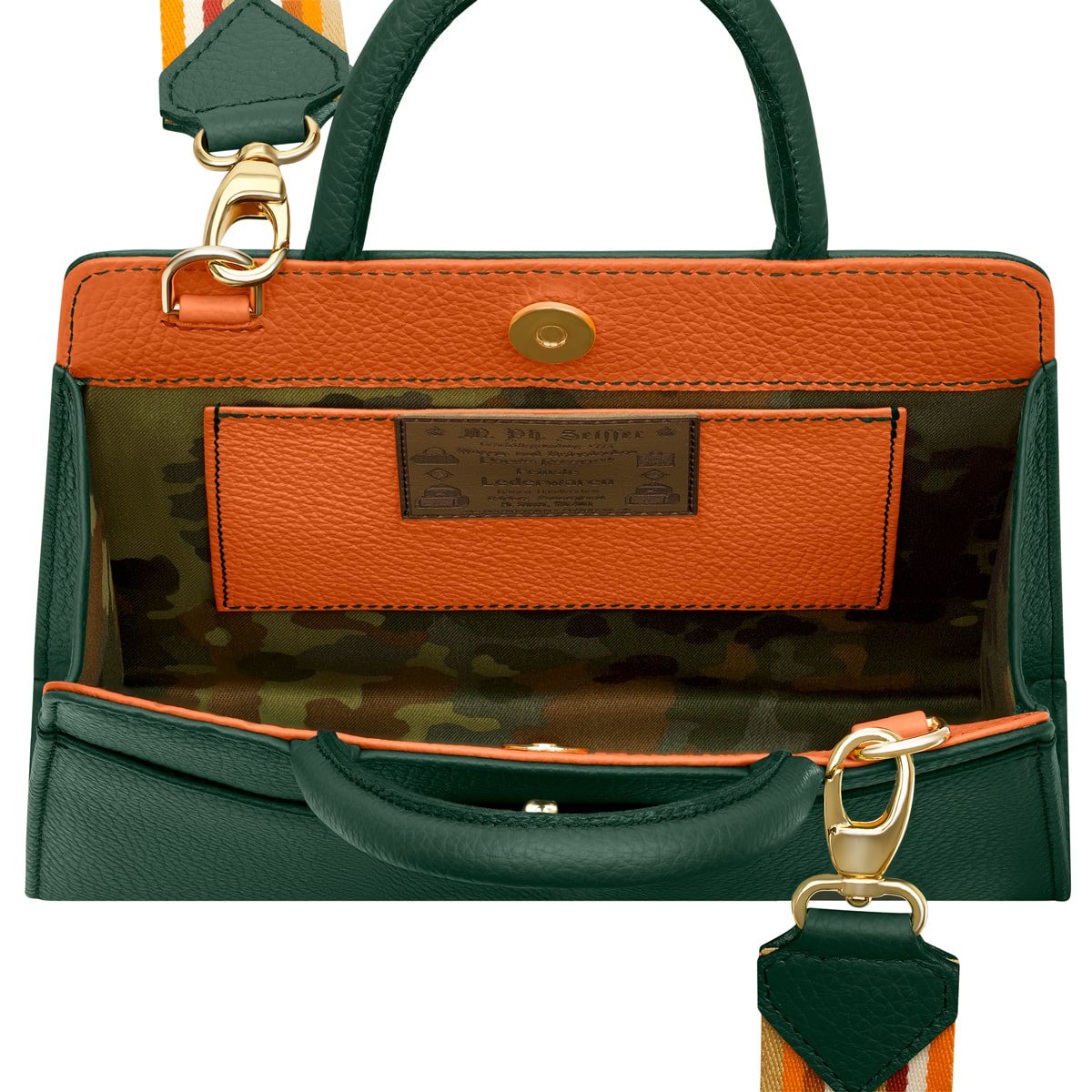 Die Paris/Cortina Mini-Handtasche von Seisser & Cie. vereint Eleganz und Vielseitigkeit: Sie kann mit Handgriffen getragen oder als Umhängetasche/Cross-Body genutzt werden. Innen sorgt eine gefütterte aufgesetzte Vordertasche mit jagdlichem „Hunter-Camouflage“-Futter für sportlich-schicke Akzente, ergänzt durch eine praktische Klemmtasche. Sauber gesetzte Kanten, Seisser-Vintage-Etiketten und Beschläge in Goldoptik unterstreichen die hochwertige Verarbeitung.