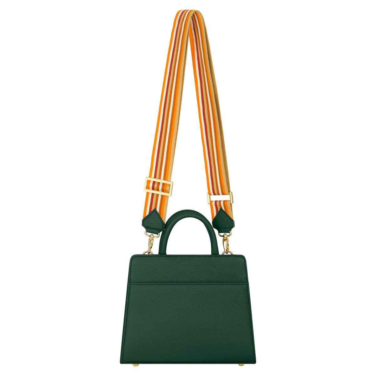 Die Tasche ist mit abnehmbarem Schultergurt bzw. Webband in drei Varianten erhältlich: aus französischem Rindsleder in Orange, aus französischem Rindsleder in Racing-Green oder aus echt sämisch gegerbtem Hirschleder.