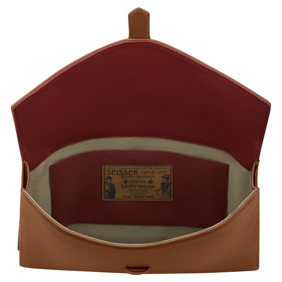 Der Überschlag /Deckel ist innen in Kontrast in französischem Rindsleder in Bordeaux/braun gefertigt.