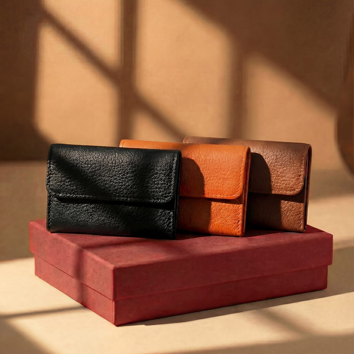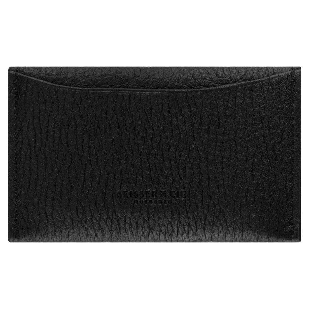 Es bietet Platz für Karten, Visitenkarten und kleine Scheine – perfekt für unterwegs oder abends. Auf der Rückseite sorgt ein geschwungenes Zusatzfach für mehr Stauraum. Gefertigt aus weichem Hirsch- oder französischem Rindsleder, gefüttert mit rotem Velours und Viskose, und veredelt mit der Seisser & Cie. Blindprägung.