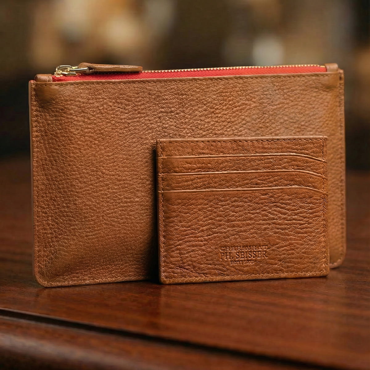 Das ROMA-Reise-Set vereint zeitlose Eleganz und Funktionalität: eine Reißverschlusstasche aus feinem Hirsch- oder französischem Rindsleder mit passendem Kredit- und Schein-Etui, 10 × 8 cm. Seit über 20 Jahren ein Unisex-Klassiker, eignet sich die Pouch (21 × 14 cm) ideal als Mini-Clutch, für Reiseunterlagen oder das Handschuhfach.