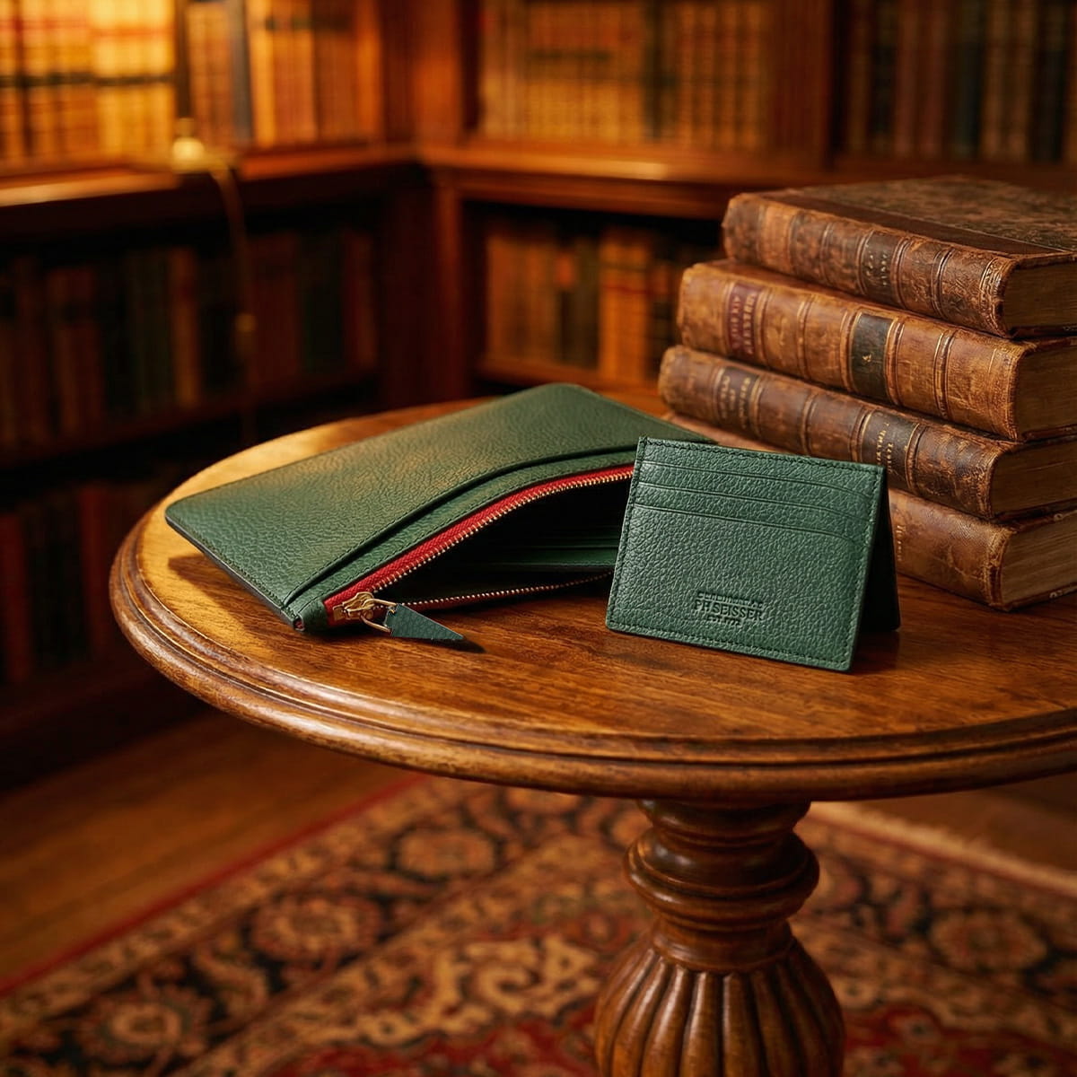 Erhältlich ist das ROMA-Set in Jagdgrün (französisches Rindsleder) oder Cognac (deutsches Hirschleder). Innen ist die Tasche mit echtem Veloursleder gefüttert, außen ergänzt eine geschwungene Tickettasche das elegante Design. Der Messing-Reißverschluss ist an den Enden mit Lederbändern eingefasst. Das passende Kredit- und Schein-Etui bietet sechs (3/3) abgerundete Kartenfächer und ist rot mit feiner Viskose und Schweinsvelours gefüttert – ein edler Kontrast zum Außenleder.